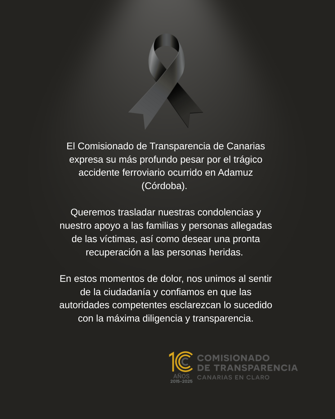 Santa Cruz de Tenerife, 19 enero de 2026.- El Comisionado de Transparencia de Canarias expresa su más profundo pesar por el trágico accidente ferroviario ocurrido en Adamuz (Córdoba).