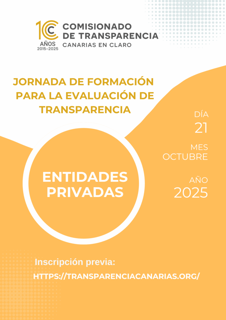 Ese mismo día, a las 10:00 horas, tendrá lugar una jornada formativa dirigida a las entidades que será inaugurada por la presidenta del Parlamento de Canarias, Astrid Pérez. El encuentro tendrá lugar en la Sala Europa del Parlamento de Canarias y será retransmitido también online, a través de Google Meet, previa inscripción en la web del Comisionado:👉https://transparenciacanarias.org/jornada-de-formacion-para-la-evaluacion-de-la-transparencia-de-las-entidades-privadas-subvencionadas-en-2024/