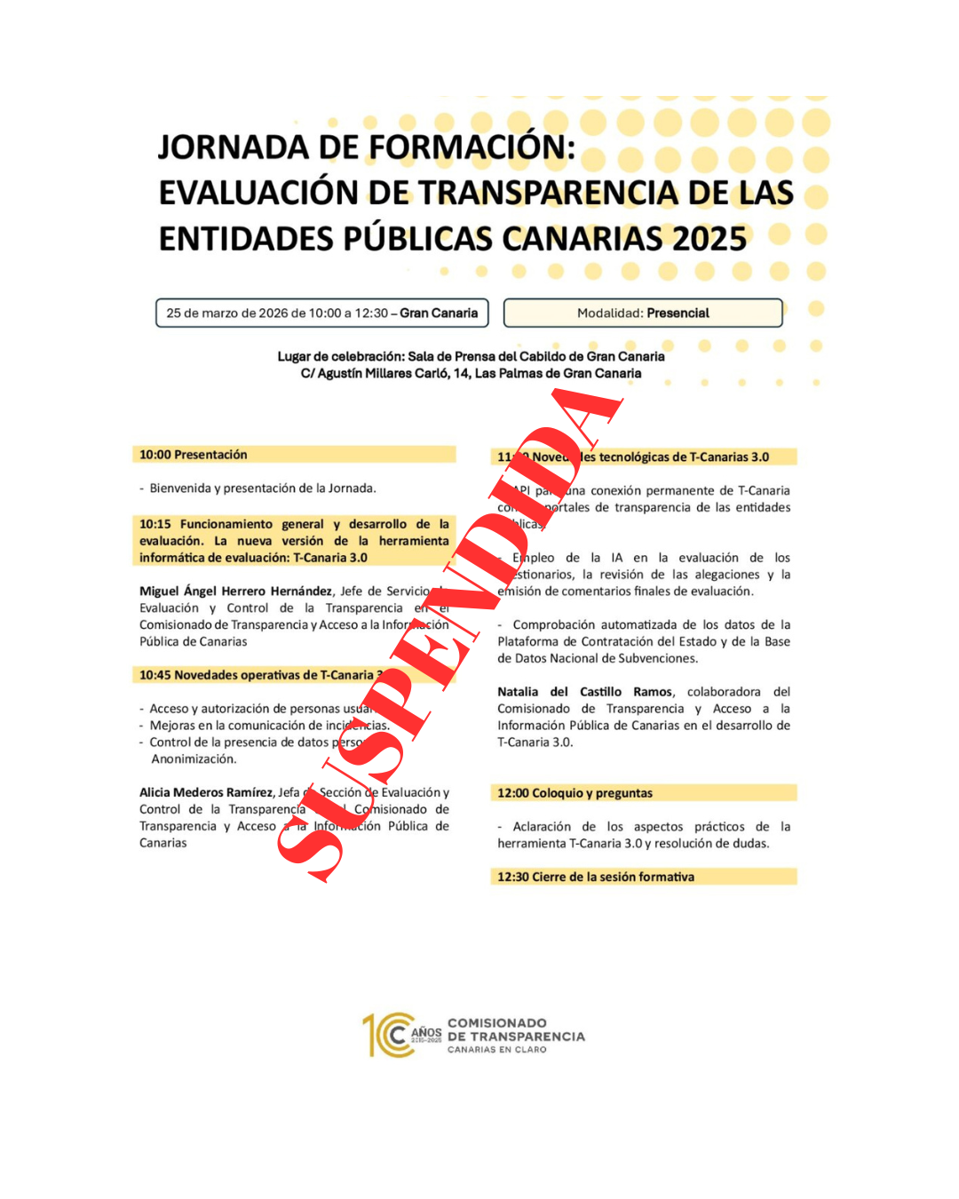 El Comisionado de Transparencia informa que la jornada formativa dirigida al personal de las entidades públicas, prevista para mañana, 25 de marzo, en el Cabildo de Gran Canaria, ha sido suspendida.